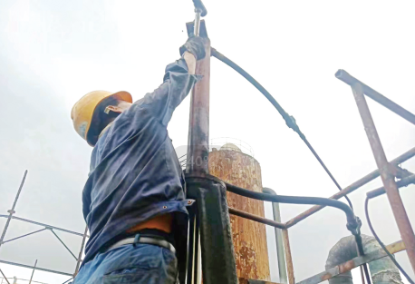 作为一名维修工,王怀俭身上不仅具备吃苦耐劳的坚韧品质,更练就了细致认真有勇有谋的真本领。在一次大修工作中,人员紧张,设备主任赵建强就把巡检任务全权交给他最放心的王怀俭。王怀俭顶着烈日,攀高爬低,按照巡检路线,逐一排查,任凭汗水湿透衣背,工作服蹭满污渍也毫不在意。巡检到8号炉加焦机时,对设备构造了如指掌的他直奔关键,手指夹在底座和油缸仅有5公分的间距中,奋力踮起脚尖,对齐胸高的加焦机底座上的6个螺栓一一紧固。紧着紧着,他的眉头凝结起来,任凭他再怎么转动扳手,有一颗螺栓也无法固定,他立刻判定该螺栓腐蚀滑丝。